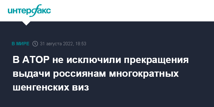 Москва. 31 августа. INTERFAX.RU - Решение Евросоюза отменить соглашение об упрощенном визовом режиме с Россией затруднит россиянам получение шенгенских виз: срок ожидания визы вырастет до полугода, консульский сбор вырастет в 2,5 раза, а выдача многократных виз может прекратиться, сообщает Ассоциация туроператоров России (АТОР).