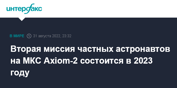 "NASA и Axiom Space подписали контракт о проведении второй частной миссии астронавтов к Международной космической станции, она состоится во второй четверти 2023 года", - говорится в сообщении управления.