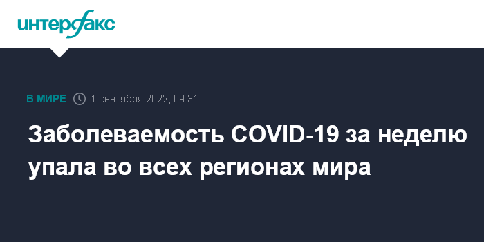 В период с 22 по 28 августа заболеваемость коронавирусом упала во всех регионах мира. Наибольшее снижение числа заражений наблюдалось в Восточном Средиземноморье (на 37%) и в Европе (на 20%).