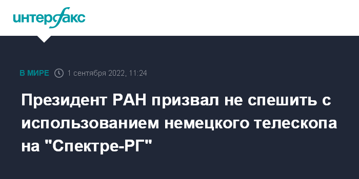 Москва. 1 сентября. INTERFAX.RU - Президент Российской академии наук Александр Сергеев призвал к осторожности в вопросах возобновления использования германского телескопа eROSITA и предложил дождаться, пока вопрос не будет решен с германской стороной. Он сказал об этом журналистам в Новосибирске.