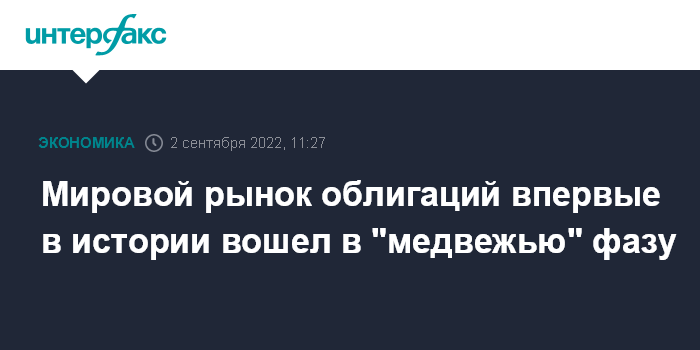 Москва. 2 сентября. INTERFAX.RU - Мировой рынок облигаций вошел в медвежью фазу впервые с момента образования на фоне агрессивных мер центральных банков по борьбе с ростом инфляции даже ценой рецессии в экономике, сообщает Bloomberg.