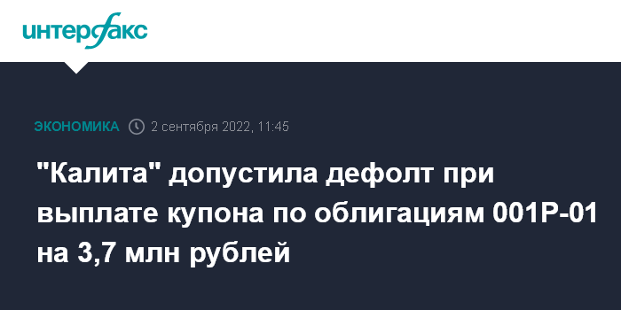 Москва. 2 сентября. INTERFAX.RU - Омское ООО "Калита" (Омск) допустило дефолт при выплате 29-го купона по облигациям серии 001Р-01 на 3,699 млн рублей из-за отсутствия денег, сообщила компания.