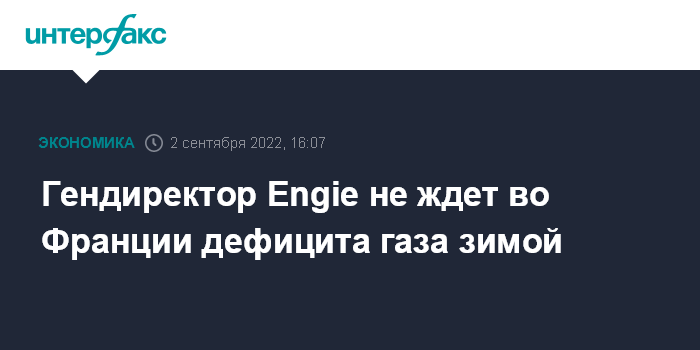 30 августа министр экологического перехода Франции Аньес Панье-Рюнаше заявил, что в стране достаточный запас газа, "на случай нормальной зимы", но нужно готовиться и на случай морозов. Глава французского комитета по регулированию энергетики (CRE) Эмманюэль Варгон заявила 31 августа, что если "Газпром" прекратит поставки газа Engie, это не скажется существенным образом на энергоснабжении Франции.