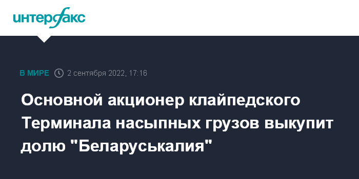Москва. 2 сентября. INTERFAX.RU - Игорь Удовицкий, крупнейший акционер подпавшего под западные санкции "Терминала насыпных грузов" (Biriu kroviniu terminalas, BKT), который до февраля 2022 года грузил удобрения "Беларуськалия" в Клайпедском порту, может консолидировать 100% акций терминала.