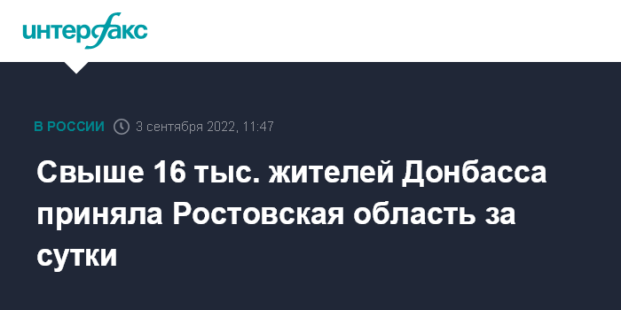 Москва. 3 сентября. INTERFAX.RU - Через пункты пропуска в Ростовскую область с территории Донбасса за последние сутки прибыли более шестнадцати тысяч человек, сообщает пресс-служба регионального погрануправления ФСБ в субботу.