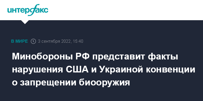 Москва. 3 сентября. INTERFAX.RU - Минобороны России заявило, что представит международному сообществу документальные подтверждения нарушений США и Украиной Конвенции о запрещении биологического и токсинного оружия.