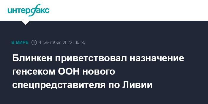 Москва. 4 сентября. INTERFAX.RU - Госсекретарь США Энтони Блинкен приветствовал назначение генеральным секретарем ООН Антонио Гутерришем своего спецпредставителя по Ливии, подчеркнув актуальность данного решения, сообщил американский госдепартамент.