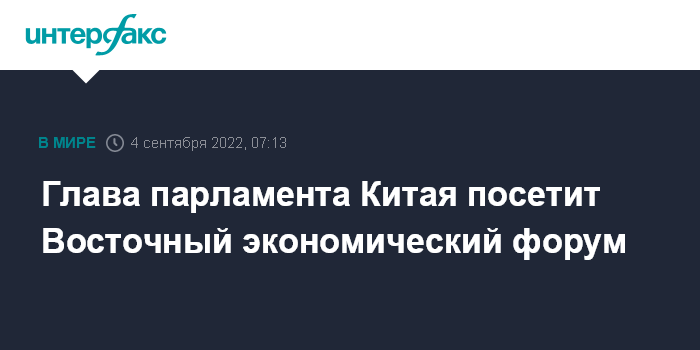 Москва. 4 сентября. INTERFAX.RU - Председатель Постоянного комитета Всекитайского собрания народных представителей Ли Чжаньшу в рамках официального визита в Россию в первой половине сентября посетит Восточный экономический форум (ВЭФ), сообщили местные СМИ.