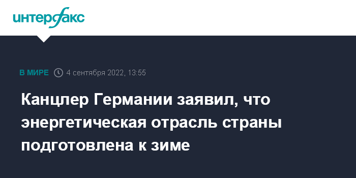 Москва. 4 сентября. INTERFAX.RU - Власти Германии подготовили энергетическую отрасль страны к предстоящей зиме, заявил в воскресенье канцлер ФРГ Олаф Шольц.