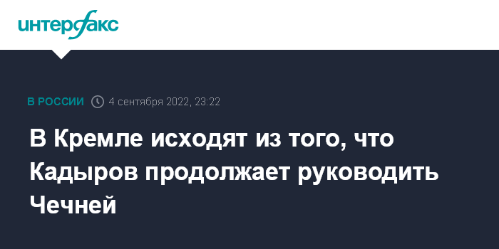 Москва. 4 сентября. INTERFAX.RU - В Кремле исходят из того, что Рамзан Кадыров в настоящее время остается руководителем Чечни, заявил пресс-секретарь президента РФ Дмитрий Песков, комментируя последние заявления чеченского лидера в Telegram.