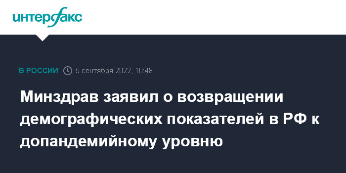 Москва. 5 сентября. INTERFAX.RU - Демографические показатели в России достигли допандемийного уровня, заявил первый заместитель министра здравоохранения РФ Виктор Фисенко.