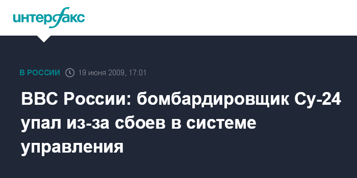 Москва. 19 июня. INTERFAX.RU - Падение фронтового бомбардировщика Су-24 в Ростовской области вызвано сбоями в системе управления самолета, сообщил "Интерфаксу-АВН" в пятницу представитель главного штаба ВВС.