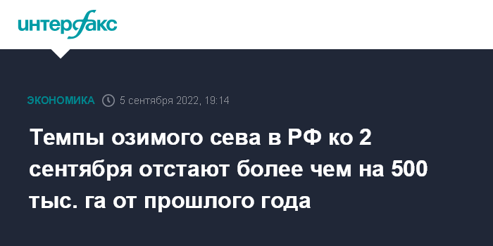 Темпы озимого сева в РФ ко 2 сентября отстают более чем на 500 тыс. га от прошлого года