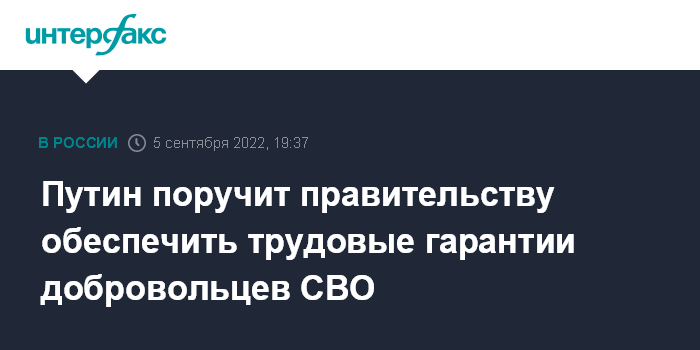 Москва. 5 сентября. INTERFAX.RU - Президент РФ Владимир Путин поручит правительству обеспечить трудовые гарантии гражданам, желающим пойти добровольцами для участия в специальной военной операции (СВО) России на Украине.