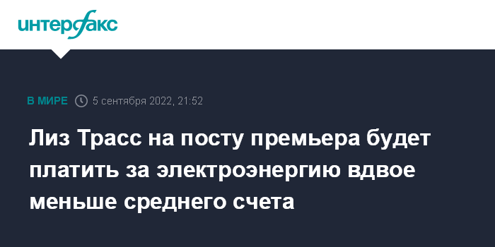Трасс после победы на выборах лидера консерваторов заявила, что "урегулирует проблему энергетического кризиса - будет заниматься счетами населения за электроэнергию, а также решать все долгосрочные проблемы с энергоснабжением". По данным телеканала Sky News, накануне Трасс обещала в случае назначения премьером в течение недели представить план борьбы с энергетическим кризисом.