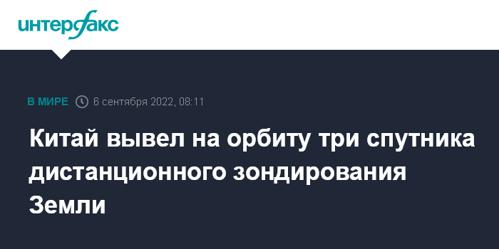 Москва. 6 сентября. INTERFAX.RU - Китай успешно вывел на орбиту три спутника дистанционного зондирования Земли (ДЗЗ) "Яогань-35". Об этом сообщила во вторник Китайская аэрокосмическая научно-техническая корпорация (CASC).