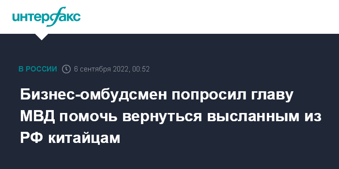 "К Титову поступило обращение председателя Союза китайских предпринимателей в России Чжоу Лицюня, согласно которому в 2021-2022 годах из страны было выслано несколько сотен граждан Китая, получивших наказание по статье 18.8 КоАП РФ за уклонение от выезда из РФ по истечении определенного срока. Это произошло, несмотря на два Указа президента, смягчающих миграционные условия на время закрытия границ между странами в период пандемии коронавируса", - сказали "Интерфаксу" в пресс-службе бизнес-омбудсмена.