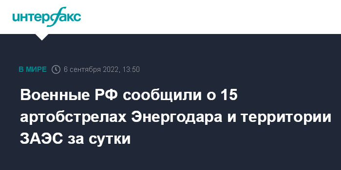 Москва. 6 сентября. INTERFAX.RU - Минобороны РФ сообщило, что за сутки зафиксировано 15 артиллерийских обстрелов Энергодара и территории Запорожской АЭС со стороны армии Украины, радиационный фон в норме.