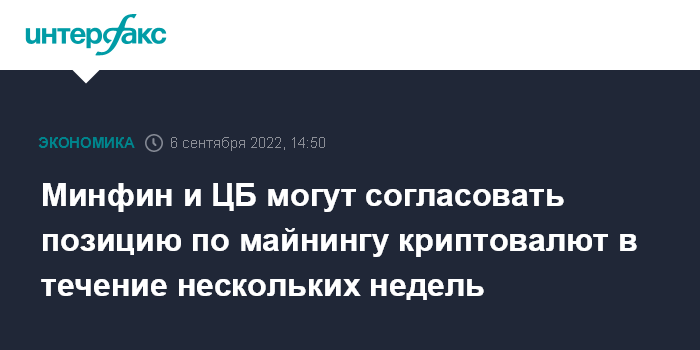 Москва. 6 сентября. INTERFAX.RU - Банк России и Минфин РФ могут согласовать позицию по регулированию майнинга криптовалют в течение нескольких недель, сообщил замминистра финансов Алексей Моисеев, выступая на ВЭФ-2022.
