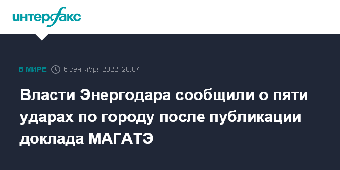 Москва. 6 сентября. INTERFAX.RU - Вооруженные силы Украины нанесли во вторник после публикации доклада МАГАТЭ уже пять ударов по Энергодару на подконтрольной РФ части Запорожской области, сообщил глава администрации города Александр Волга.