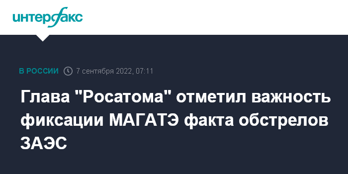 Москва. 7 сентября. INTERFAX.RU - Отчет миссии МАГАТЭ по итогам посещения Запорожской АЭС содержит информацию об обстрелах станции, заявил глава Росатома Алексей Лихачев.