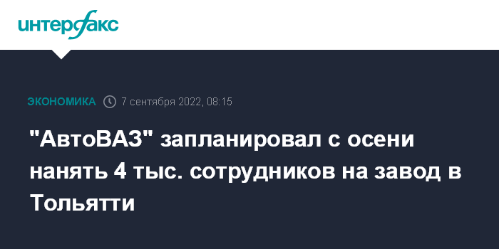 Москва. 7 сентября. INTERFAX.RU - "АвтоВАЗ" намерен с осени дополнительно нанять 4 тысячи сотрудников на автозавод в Тольятти. ОБ этом сообщил в интервью "Интерфаксу" в кулуарах ВЭФ-2022 президент компании Максим Соколов.