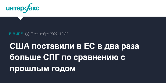 Москва. 7 сентября. INTERFAX.RU - Евросоюз с начала этого года получил из США уже более 40 млрд кубометров газа в виде СПГ, что почти в два раза превышает объемы поставок за весь 2021 год. Об этом заявила в среду уполномоченная Европейской комиссии по энергетике Кадри Симсон.