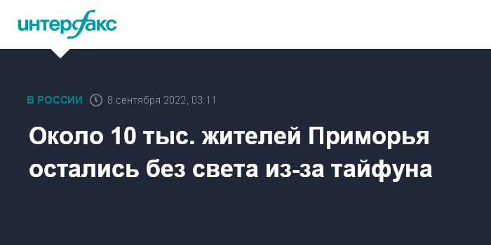Москва. 8 сентября. INTERFAX.RU - В Приморском крае нарушено электроснабжение в 41 населенном пункте, без света остались порядка 10 тыс. человек, сообщает в четверг пресс-служба регионального правительства.