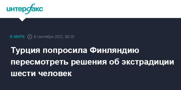 Москва. 8 сентября. INTERFAX.RU - Турция попросила официальный Хельсинки пересмотреть шесть запросов об экстрадиции, отклоненных Финляндией в течение лета. Об этом сообщил в четверг портал Yle со ссылкой на министерство юстиции.