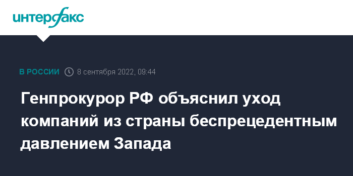 Москва. 8 сентября. INTERFAX.RU - Иностранные компании, покидающие российский рынок, делают это не по своей воле, а под давлением западных политиков, заявил генеральный прокурор РФ Игорь Краснов в интервью "Интерфаксу".