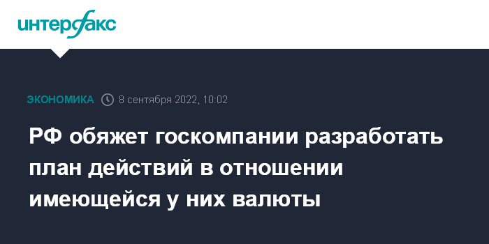 Москва. 8 сентября. INTERFAX.RU - РФ предпишет компаниям с госучастием разработать план действий в отношении имеющейся у них валюты.