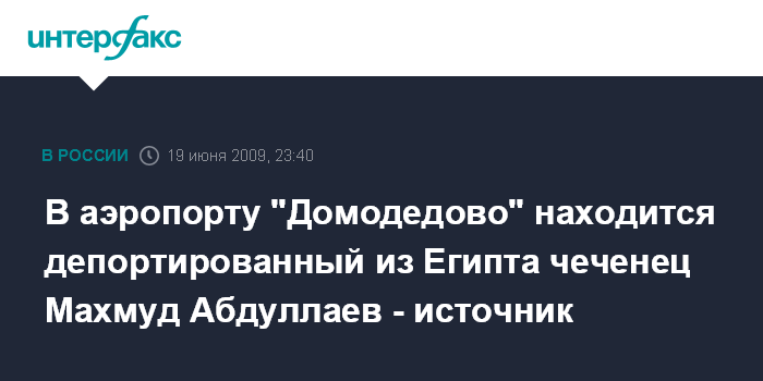 Москва. 19 июня. ИНТЕРФАКС - Махмуд Абдуллаев, являющийся, по неофициальным данным, сыном одного из лидеров чеченских сепаратистов, депортирован из Египта в Россию с другими студентами и уже более четырех часов находится в пограничной зоне аэропорта Домодедово.