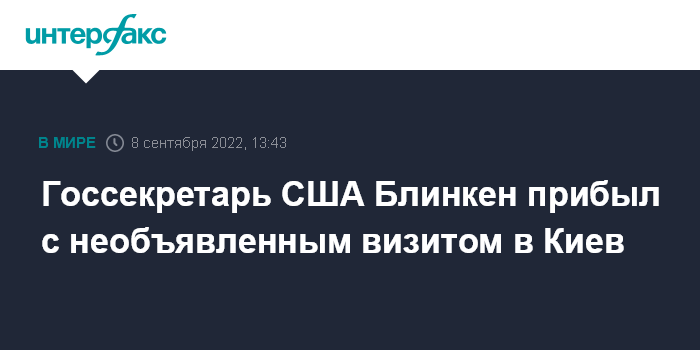 Москва. 8 сентября. INTERFAX.RU - Госсекретарь США Энтони Блинкен в четверг прибыл в Киев, причем о его визите до этого не сообщали, передает агентство Associated Press.