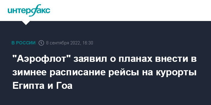 Москва. 8 сентября. INTERFAX.RU - "Аэрофлот" в зимнем расписании может начать летать из Москвы в египетские Шарм-эль-Шейх и Хургаду, а также в индийский штат Гоа, сообщил гендиректор компании Сергей Александровский журналистам на Восточном экономическом форуме (ВЭФ-2022).