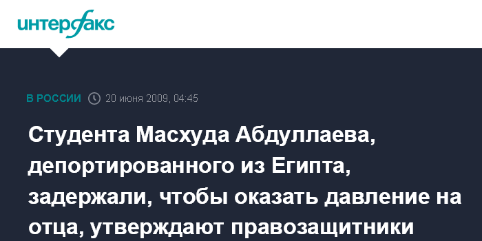 Москва. 20 июня. ИНТЕРФАКС - Правозащитники обеспокоены судьбой студента, депортированного накануне из Египта в Россию - Масхуда Абдуллаева, который является сыном одного из лидеров чеченских боевиков Супьяна Абдуллаева.