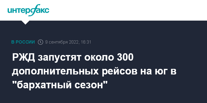 Отмечается, что в "бархатный сезон" по этим направлениям планируется перевезти свыше 2 млн пассажиров, что в 1,5 раза больше показателя аналогичного периода прошлого года и более чем на 20% превышает показатели 2019 года. Для удовлетворения спроса пассажиров на перевозки в сообщении с югом России назначено порядка 300 дополнительных рейсов по этим направлениям.