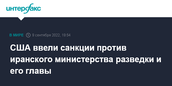 Москва. 9 сентября. INTERFAX.RU - США ввели ограничительные меры против министерства разведки и национальной безопасности Ирана и его главы – Сейеда Эсмаила Хатиба. Об этом говорится в заявлении американского Минфина, распространенном в пятницу.