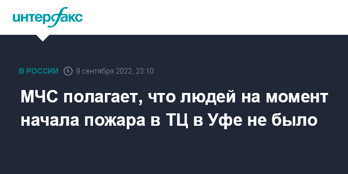 Москва. 9 сентября. INTERFAX.RU - Людей в горящем павильоне торгового комплекса "Меркурий" в Уфе на момент начала пожара, по предварительным данным, не было, сообщил журналистам начальник ГУ МЧС по Башкирии Марат Латыпов в пятницу вечером.