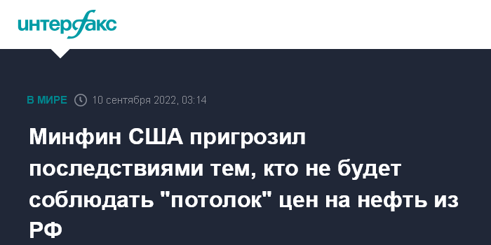 Москва. 10 сентября. INTERFAX.RU - Закупщики российской нефти, которые, в случае введения США и их партнёрами потолка цен на нефть из РФ, сознательно будут уклоняться от этих ограничений, столкнутся с последствиями, заявил замминистра финансов США Уолли Адейемо.