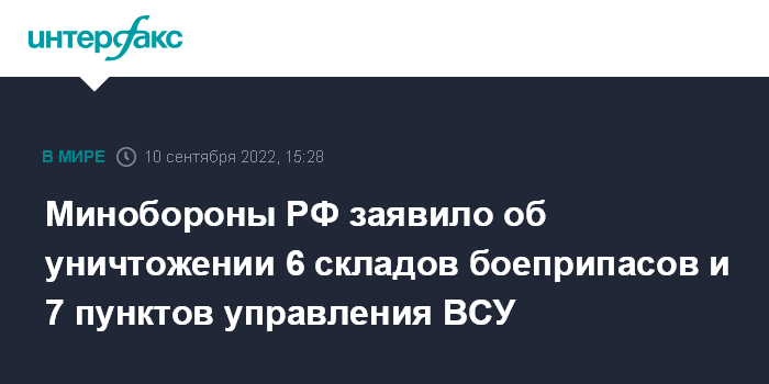 Москва. 10 сентября. INTERFAX.RU - Российские военные за сутки уничтожили шесть ракетно-артиллерийских складов Вооруженных сил Украины в ДНР, Днепропетровской и Запорожской областях, заявили в Минобороны РФ.