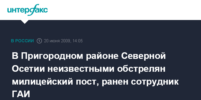 "Инцидент произошел в 12:40 мск субботы. По предварительным данным, по милицейскому посту, где несут совместную службу военнослужащие Внутренних войск и сотрудники североосетинской милиции, снайпер открыл огонь, в результате чего получил ранение прапорщик милиции, сотрудник ГИБДД Пригородного района", - сказал представитель штаба.