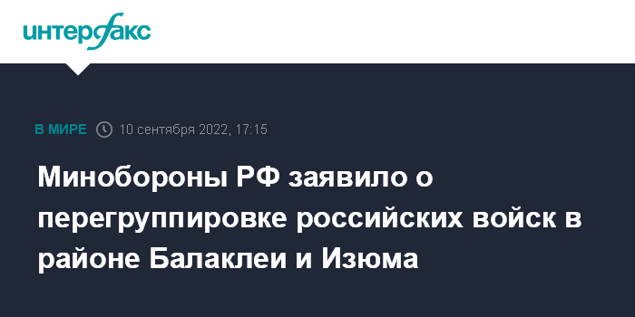 Москва. 10 сентября. INTERFAX.RU - Минобороны РФ заявило, что для достижения целей СВО по освобождению Донбасса принято решение перегруппировать российские войска в районах Балаклеи и Изюма для наращивания усилий на Донецком направлении.