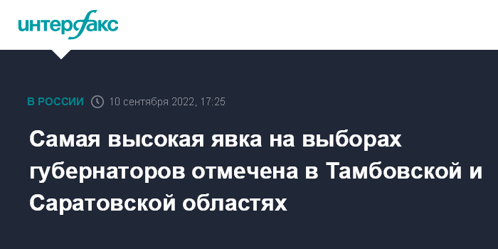 Москва. 10 сентября. INTERFAX.RU - Явка избирателей в 11 субъектах России в рамках выборов высших должностных лиц в настоящее время составила от 10% до почти 37%; самая высокая явка зафиксирована в Тамбовской и Саратовской областях, сообщили в Центризбиркоме России.