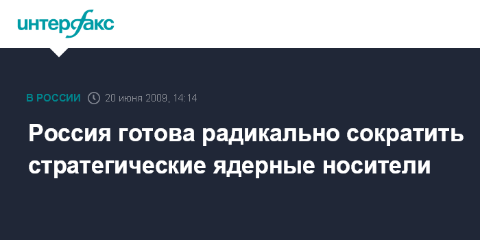 Москва. 20 июня. INTERFAX.RU - Президент Дмитрий Медведев заявил, что Россия готова к радикальным сокращениям стратегических ядерных носителей.