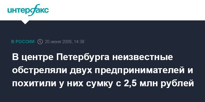 Москва. 20 июня. INTERFAX.RU - В Петербурге накануне на Васильевском острове двое неизвестных в масках напали на предпринимателей и отобрали сумку с 2,5 млн рублей, сообщил "Интерфаксу" источник в правоохранительных органах города.