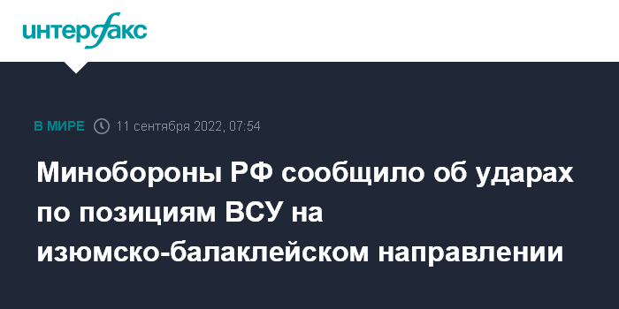 Москва. 11 сентября. INTERFAX.RU - Министерство обороны РФ заявило, что российские самолеты Су-25 уничтожили на изюмско-балаклейском направлении замаскированные полевые позиции и бронетехнику армии Украины.
