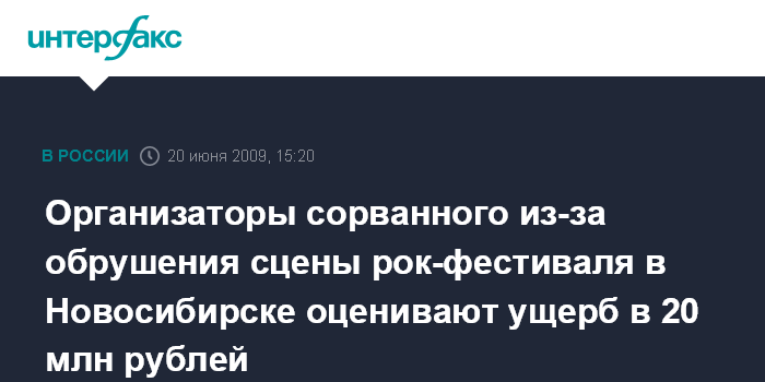 Москва. 20 июня. INTERFAX.RU - Предварительную сумму ущерба подсчитали организаторы рок-фестиваля в Новосибирске, сорванного в субботу из -за обрушения сцены с аппаратурой весом в несколько тонн.