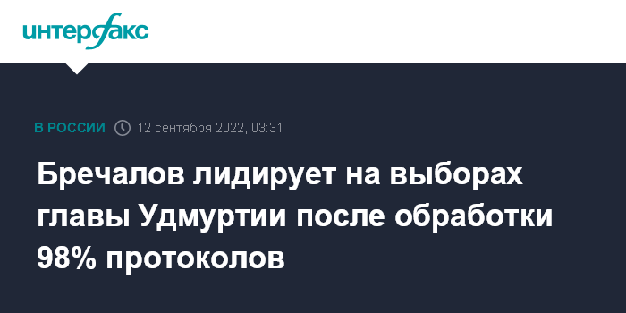 Москва. 12 сентября. INTERFAX.RU - Действующий глава Удмуртии Александр Бречалов получает 64,35% голосов на выборах на этот пост по итогам обработки 98,02% протоколов, следует из материалов ЦИК РФ.