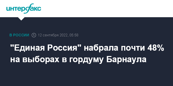 Москва. 12 сентября. INTERFAX.RU - "Единая Россия" набрала 47,98% голосов избирателей на выборах в городскую думу Барнаула по результатам обработки 100% бюллетеней, сообщает ЦИК РФ.