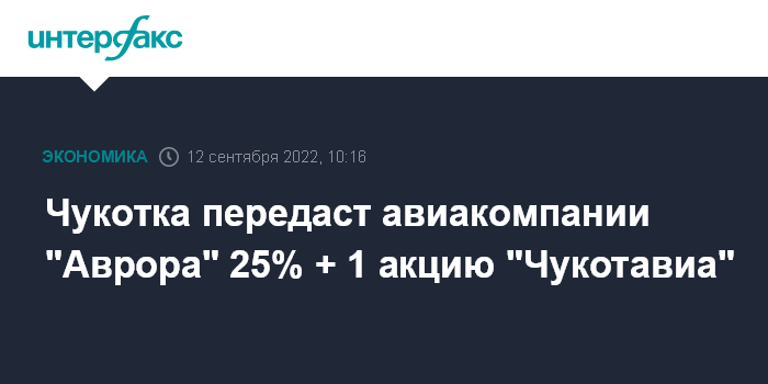 Москва. 12 сентября. INTERFAX.RU - Чукотка передаст 25% + 1 акцию принадлежащей региону авиакомпании "Чукотавиа" дальневосточной авиакомпании "Аврора", сообщила пресс-служба аппарата губернатора и правительства Чукотского автономного округа.